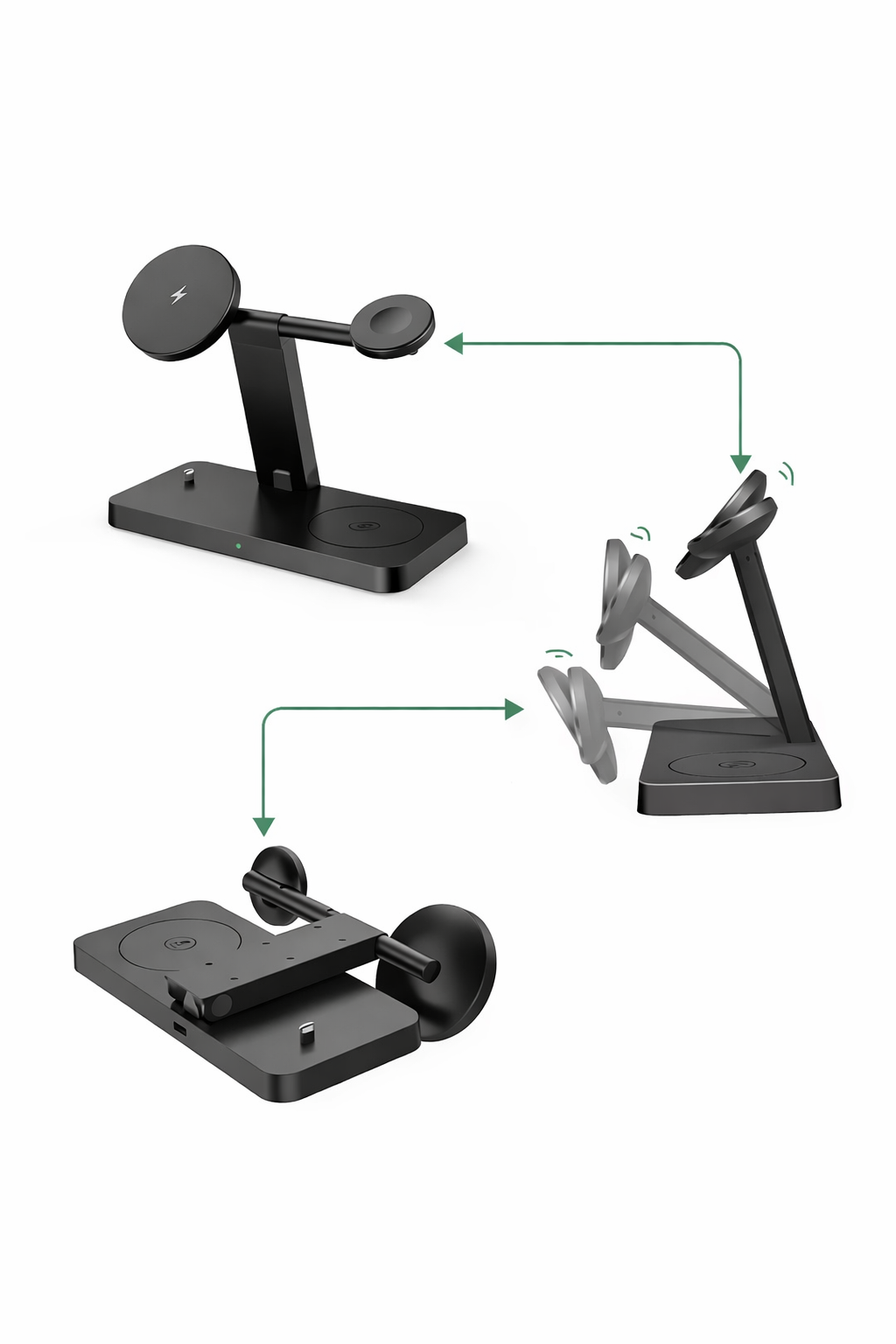 Disponible en plusieurs versions (4-en-1 ou 5-en-1), elle permet de recharger simultanément votre iPhone, votre Apple Watch / Samsung Watch, vos écouteurs sans fil, et d’autres appareils via USB filaire, tout en conservant un design pliable, compact et élégant.